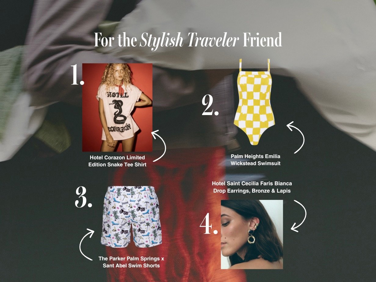 If your suitcase is essentially a style manifesto, this category will speak to you. These pieces blur the line between fashion and travel, offering that effortless, checked-in chic vibe no matter where you land. Picture the Parker Palm Springs x Sant Abel swim shorts for poolside charisma, Hotel Saint Cecilia’s sculptural Faris earrings for instant polish, a limited-edition Hotel Corazon tee that feels perfectly worn-in, and Palm Heights’ Emilia Wickstead swimsuit for that jet-set glow. Consider them your upgraded boarding-pass companions.