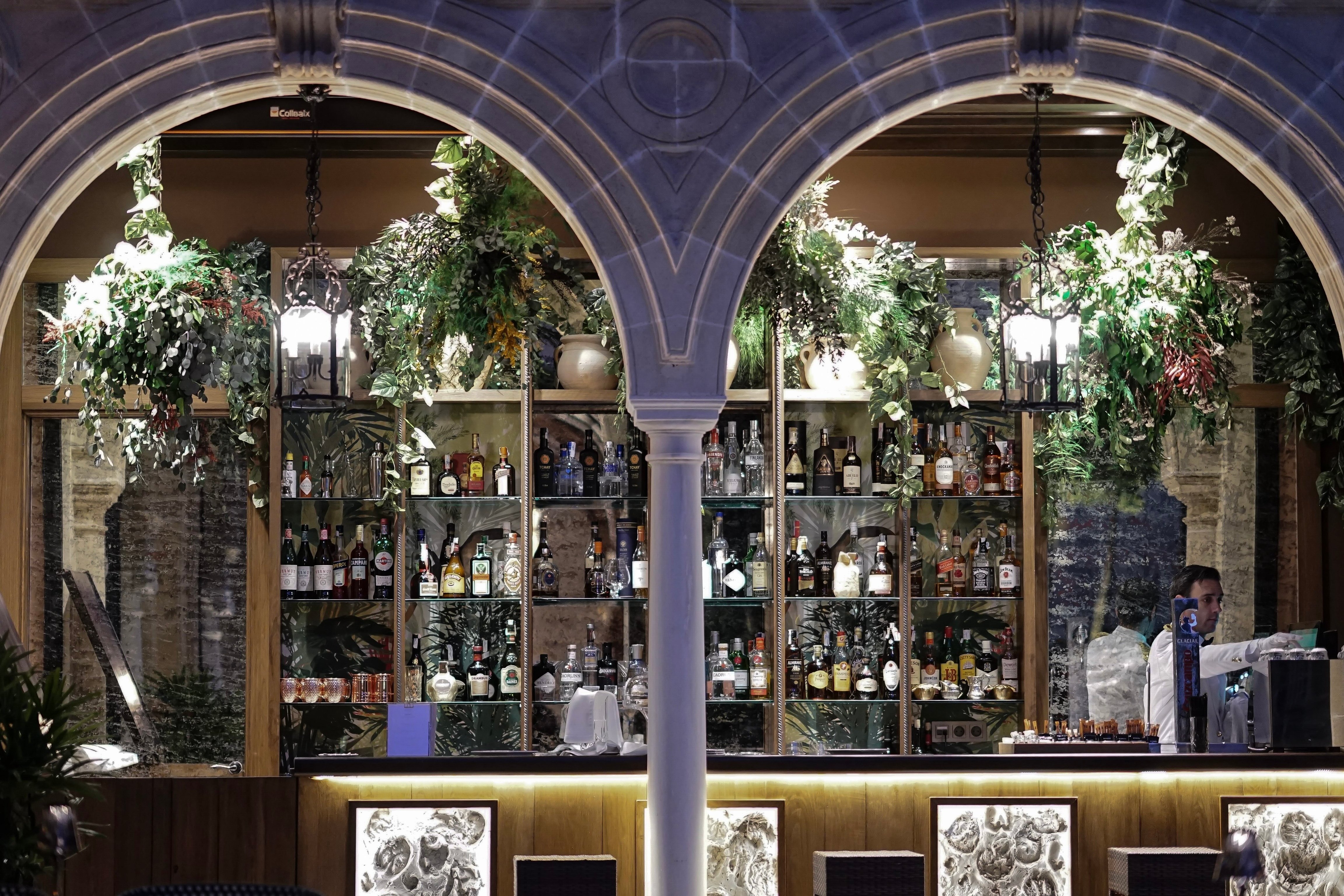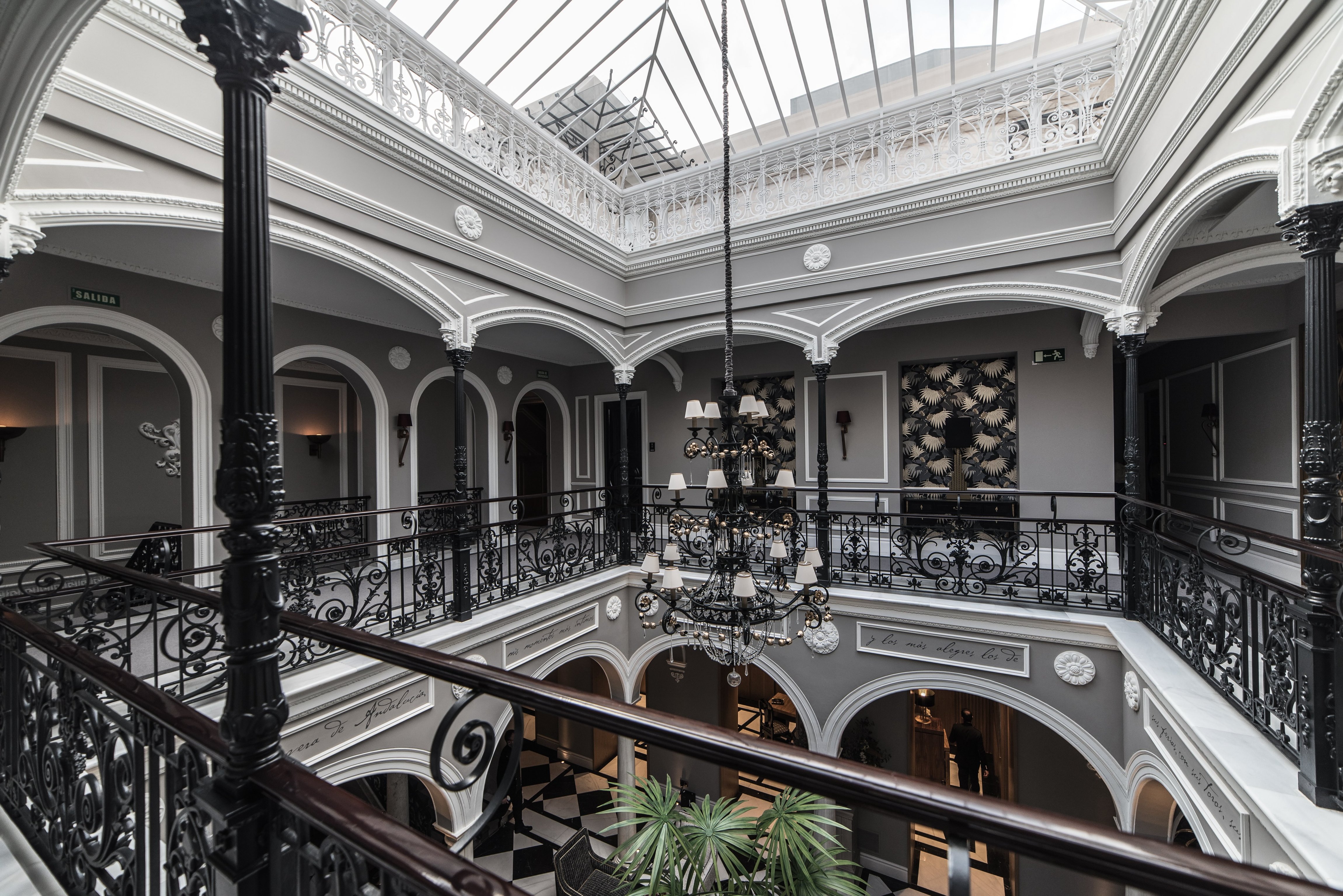 The original palace layout remains intact, from the plant-filled colonnaded atrium (now topped with a glass roof) to the wraparound gallery above, where bedroom suites open onto views of the courtyard below. Architect Pedro Rodríguez de Pineda and interior designer Alejandra Pombo led the restoration in collaboration with Jerez's heritage office, reimagining the space in a moody neoclassical style—lacquered black doors against polished marble, gilded antique mirrors, and a restrained palette of black, white and grey punctuated by patterned wallpapers, fresh flowers and subtle oriental accents.