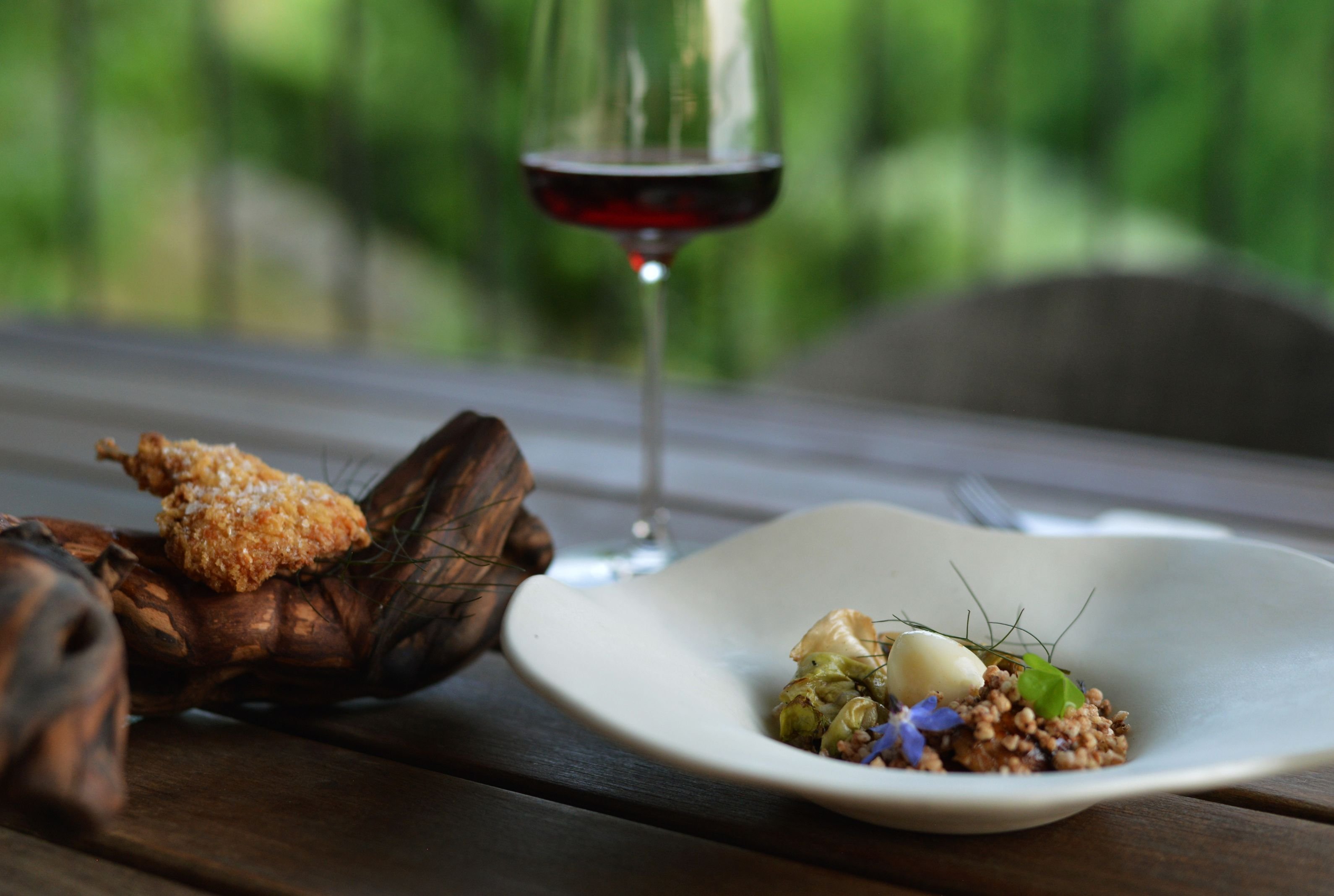 Each of the 13 rooms, the result of a restorative approach, has its own distinct personality. Five are in the Dimora dei Poeti, dedicated to great Piedmontese authors like Cesare Pavese and Natalia Ginzburg, with every detail designed to evoke their voices. My favorite is “La Bellezza Esiste,” a tribute to Gianmaria Testa: a suite that feels like an artist’s postcard, with a terrace and large windows framing the vineyards and rolling hills. The other 8 rooms are in the Dimora degli Artisti, like works of art you can actually live in, offering a visual and sensory journey. But the crown jewel is La Casa sospesa tra le Vigne, a wooden suite suspended five meters above the ground, particularly loved by couples. A tip: don’t draw the curtains—the soft pink light of dawn over the Monte Rosa, the largest mountain massif in the Alps, and the Monferrato vineyards is an unforgettable sight.