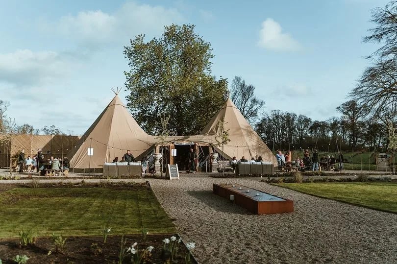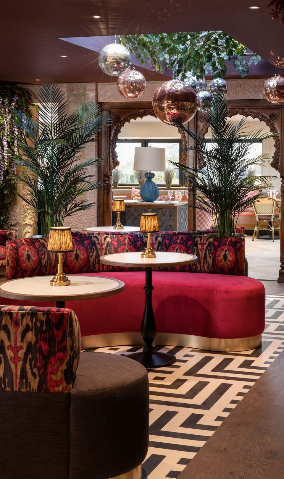 Colourful interiors are a stark contrast to the muted brick of the main building- the perfect medley of fantasy and bold prints. The reception features a striking truss roof and a large flowering tree sat atop a vibrant orange couch. In keeping with the element of surprise, a large tipi sits just outside. Donned in twinkle lights and cozy seating in the winter months, this space is filled with the smell of wood-fired pizzas, winter warmers, crackling fires, and a menu of seasonal drinks. The bar area is nestled under glittering disco balls and decorated with fuschia-print couches, emerald-green booths, and large topiaries, while the restaurant is bright with shades of peach and light pinks.