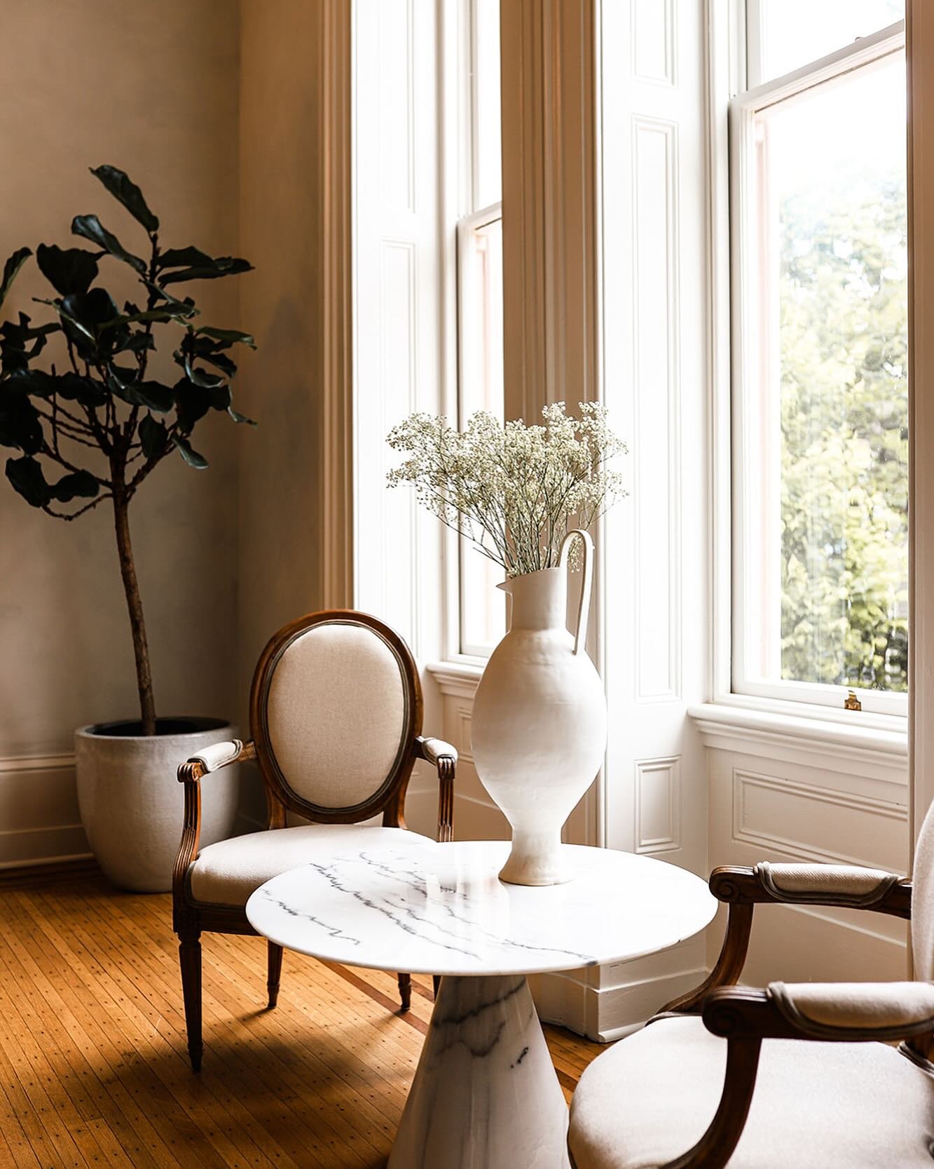 The property’s nine rooms are peaceful and well-appointed. Across the five historic and four standard rooms, vintage rugs, old-fashioned room keys, and high ceilings confer a historic air without sacrificing comfort. The bathroom is done up with vertical subway tile and products from Grown Alchemist.
