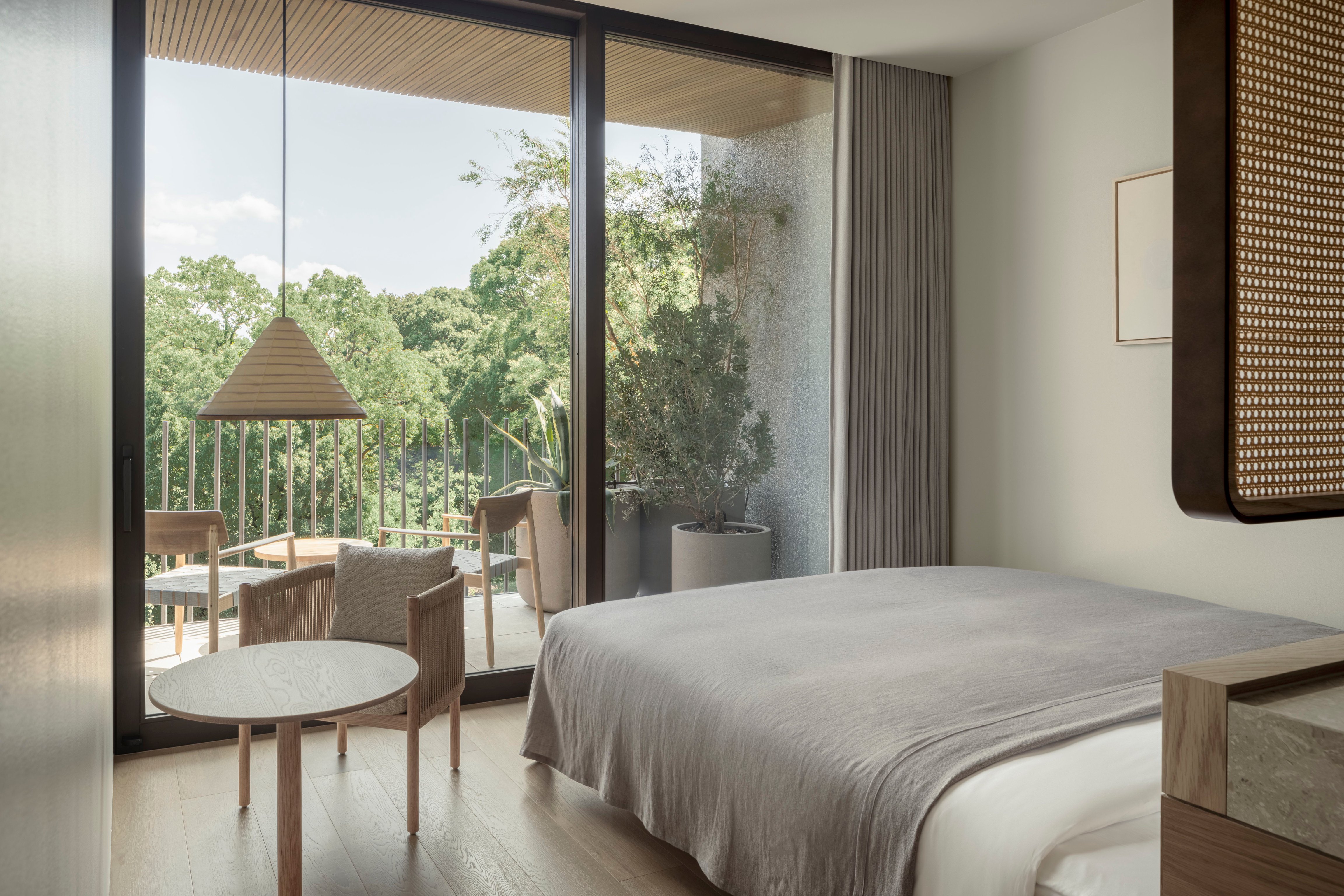 The design narrative extends to the rooms, all of which feature bespoke furnishings, floor-to-ceiling windows that stream in natural light, and balconies. For a private, exclusive experience, book the top-floor Owners Suite, complete with separate living and sleeping spaces, a foliage-shrouded balcony, and a terrace overlooking the pool and verdant Yoyogi Park.