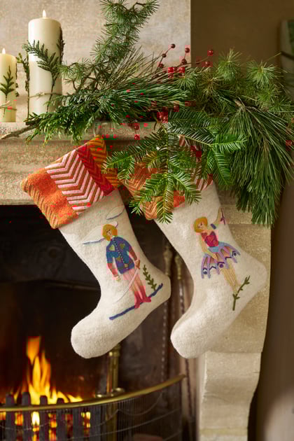 “Hanging the Christmas Stockings. Our collaged stockings are a joyful way to add festive flair, perfect as gifts or charming décor, whether hung by the fireplace or climbing jauntily up the stairs. This year, I’m loving our two new handmade appliqué designs featuring a Gallant Knight ready to conquer Christmas, and our Cocktail Shaker Mythical Creature stocking, to stir up some holiday mischief!”