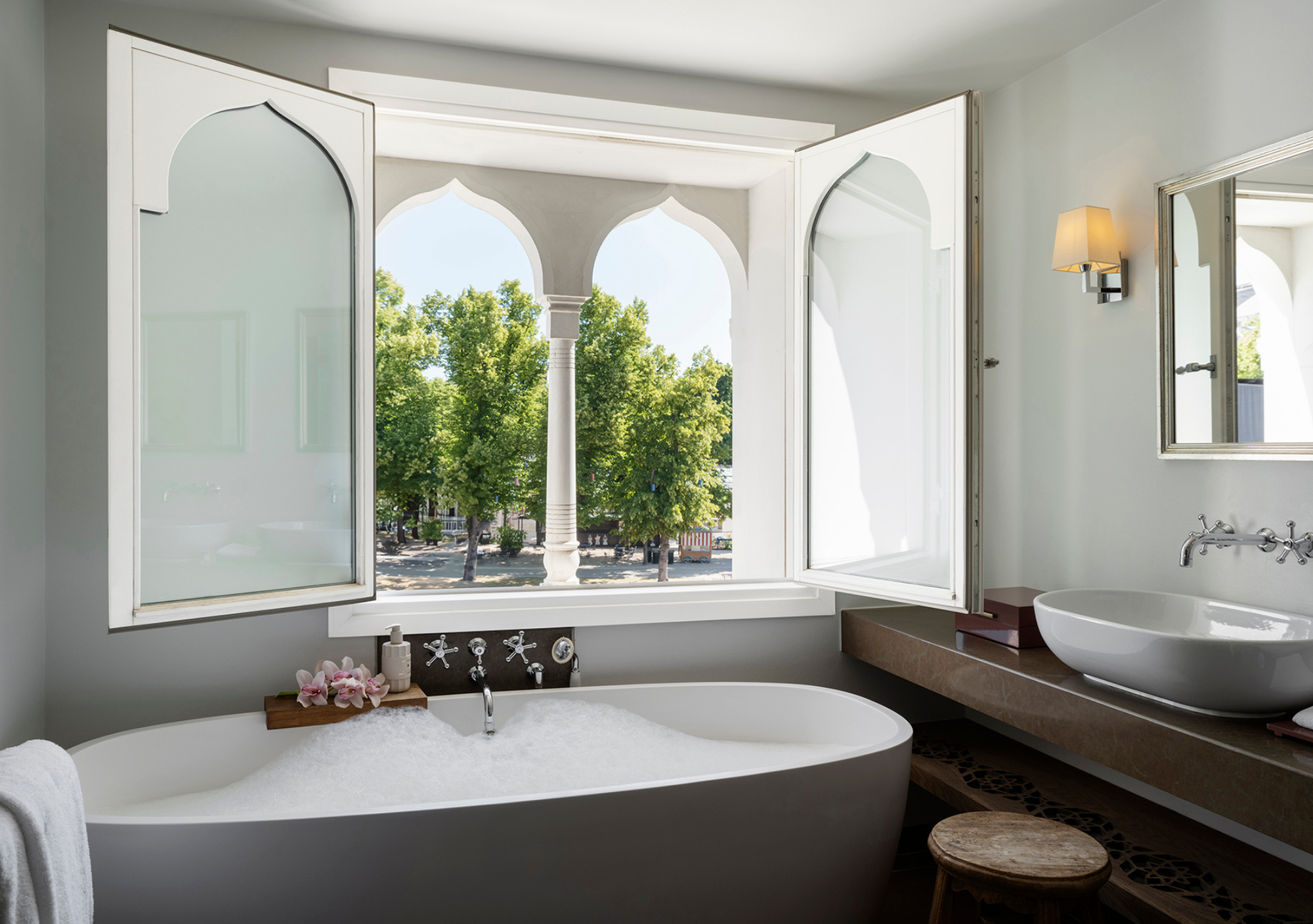 Meant to be a folly, in keeping with the whimsical zeitgeist of the park, Nimb was built in 1909. It sports a playful Moorish castle profile, with domes and minarets and a Venetian marble facade. Inside, it’s a veritable cabinet of curiosities, brimming with art, artifacts, Danish design elements, edgy accents , chandeliers, bird motifs, and urbane sensibilities. Think: Moooi’s desk lamps, sleek lines, maximalist nooks and lavish fabrics. The atmosphere marries friendly with swanky.